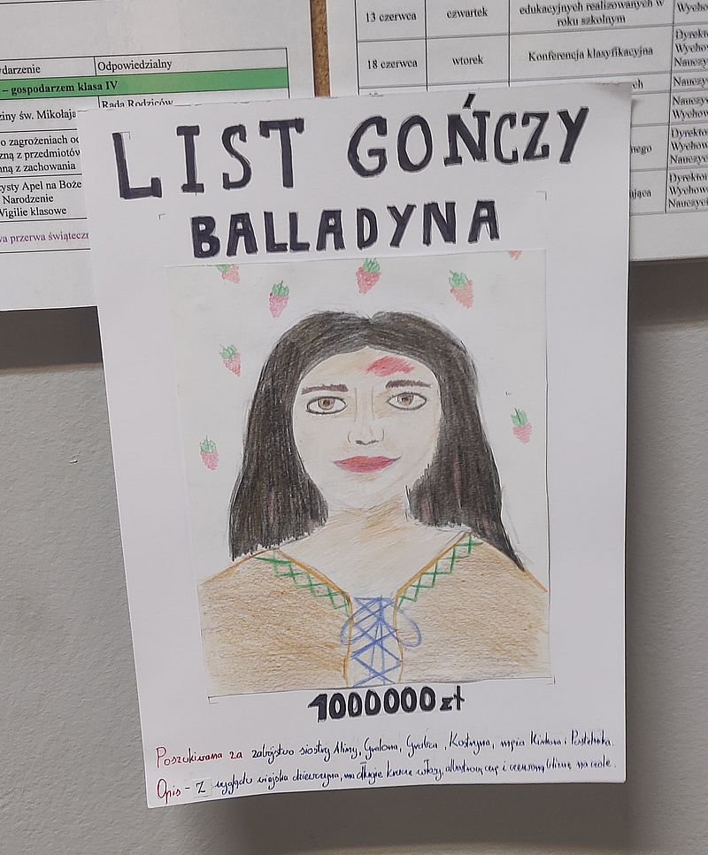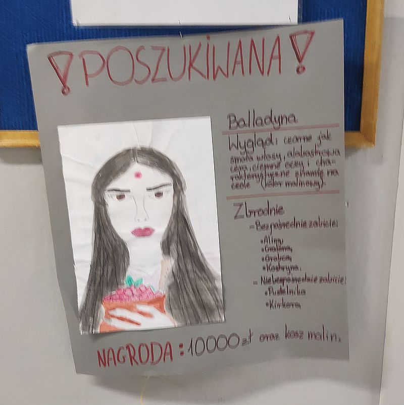23 kwietnia w naszej szkole można było spotkać bohaterów dramatu Juliusza Słowackiego przemykających korytarzami. List gończy za Balladyną wskazywał na zbliżający się sąd nad bohaterką. Uczniowie klasy 7 zmienili klasę lekcyjną w salę sądową i osądzili poszukiwaną. Lekcja języka polskiego stała się niecodzienną możliwością powtórzenia wiadomości z tej ważnej lektury.