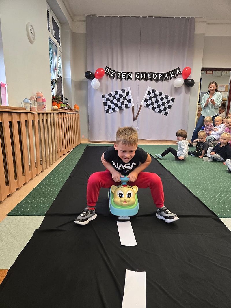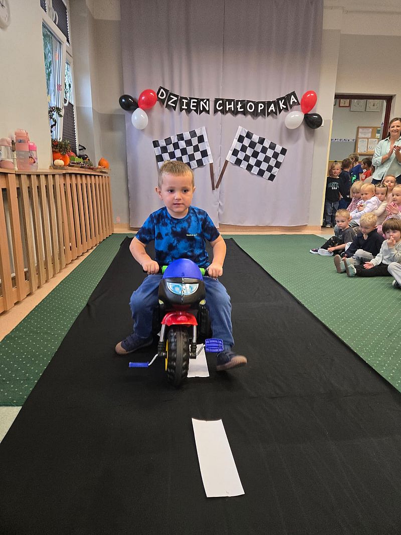 Jak co roku, w ostatni dzień września, nasze przedszkolaki świętowały Dzień Chłopaka. Tego dnia chłopcy mieli okazję stać się mistrzami kierownicy. Na wybranym pojeździe, z rykiem silników, radośnie przejechali specjalną trasę. Dziewczynki, dumne ze swych kolegów, dzielnie dopingowały brawami z trybun. Święto to pozwoliło czerpać radość ze wspólnej zabawy oraz było okazją do budowania atmosfery życzliwości wśród dzieciaków.