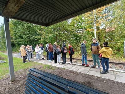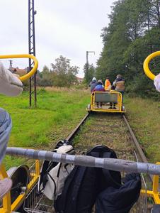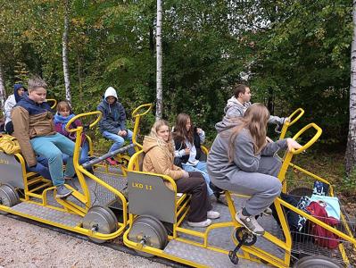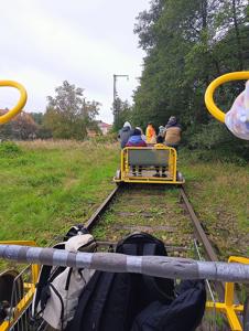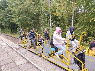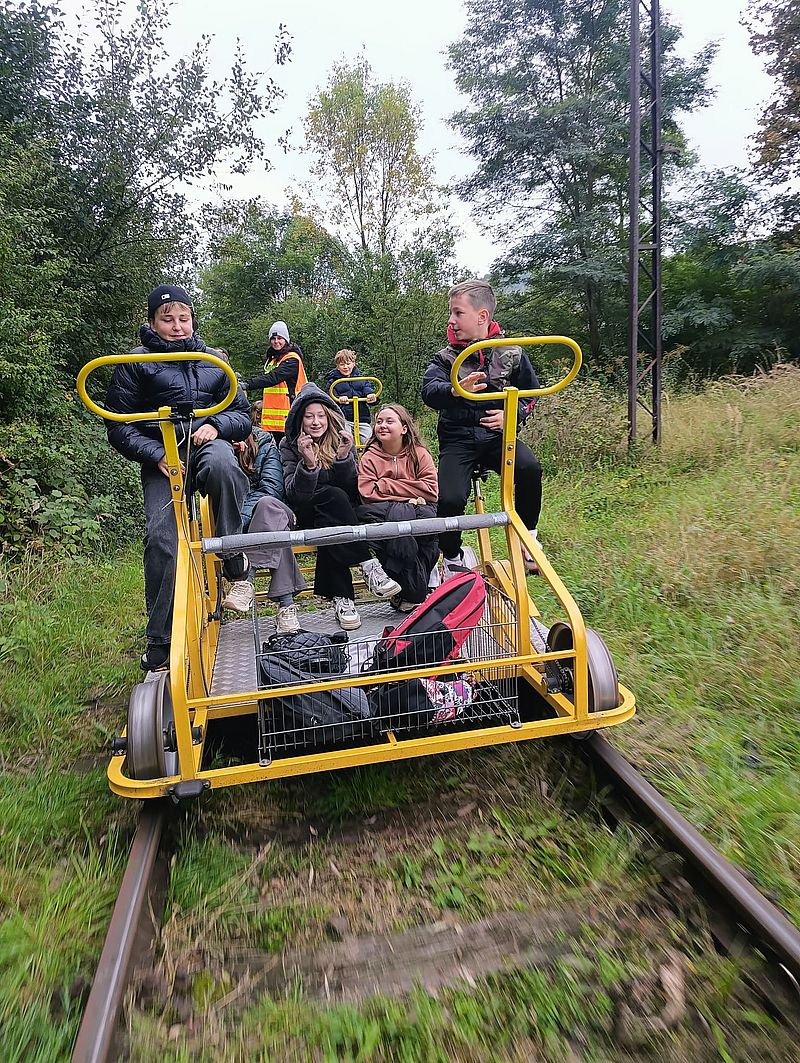 Kolejnym etapem była podróż niezwykłą, lokalną koleją drezynową. Uczniowie mieli okazję sami wprawiać drezyny w ruch, co okazało się nie tylko świetną zabawą, ale też nie lada wyzwaniem. W trakcie przejazdu podziwiali piękne krajobrazy, w tym malownicze zakątki Puszczy Dulowskiej.