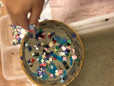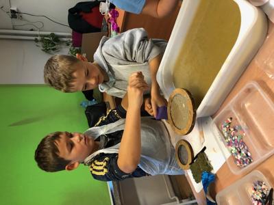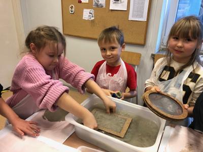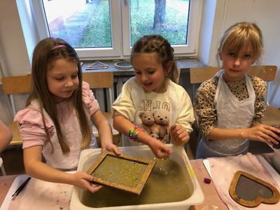 Następnie uczestnicy przygotowali pulpę papierową z makulatury, którą własnoręcznie mieszali i odciskali na specjalnych sitach. Każde dziecko mogło samodzielnie wykonać swój arkusz papieru, ozdabiając go suszonymi kwiatami, kolorowymi serwetkami lub kawałkami gazet.
