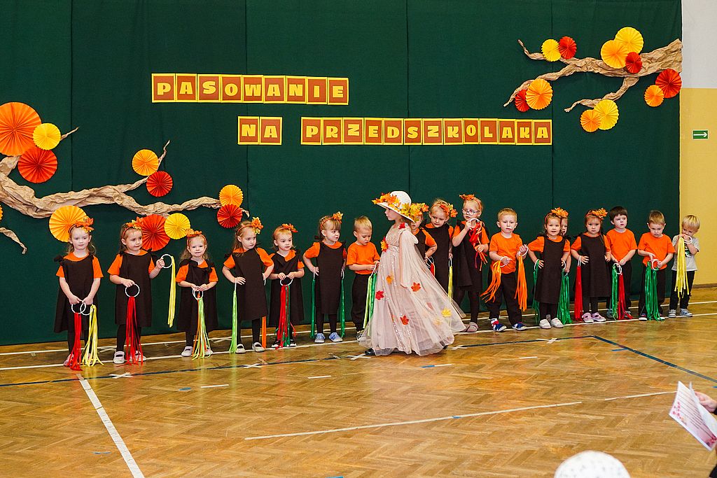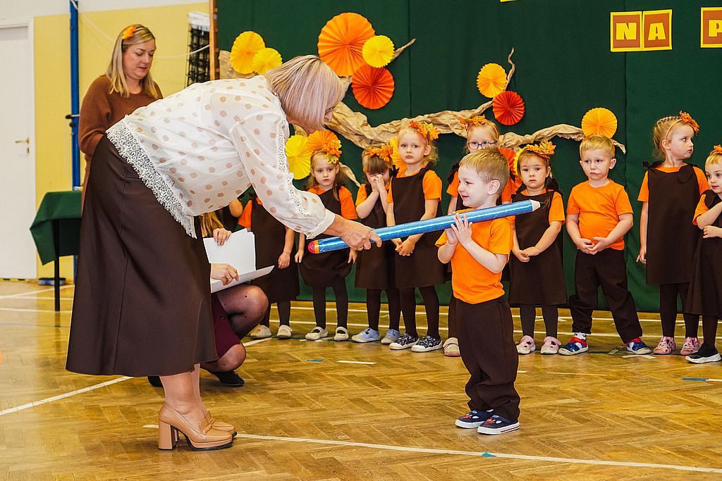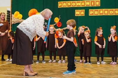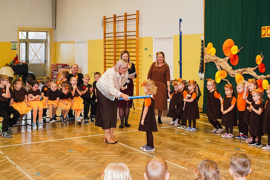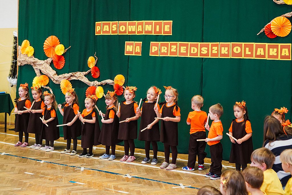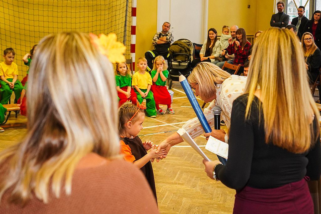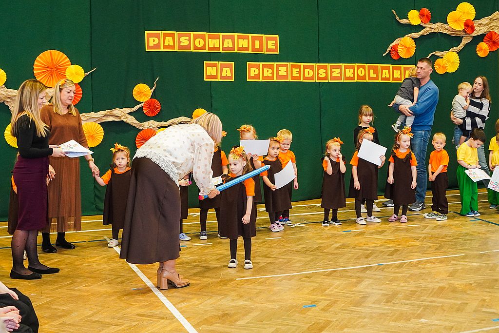 20 listopada w naszym przedszkolu odbyła się uroczystość pasowania. Dzieci zaprezentowały jesienne wierszyki i piosenki, wprowadzając wszystkich w radosny, jesienny klimat. Następnie odbyły się tańce – maluchy z zaangażowaniem wykonały przygotowane układy, pokazując swoje pierwsze sceniczne umiejętności. Nie zabrakło również elementu muzycznego- średniaki z dumą zagrały na instrumentach, tworząc rytmiczną oprawę muzyczną. Kolejną atrakcją był występ starszaków, którzy przygotowali taniec z kolorowymi chustami. Barwne rekwizyty, płynne ruchy oraz wesoła muzyka sprawiły, że pokaz zdobył ogromne brawa. Najważniejszym punktem wydarzenia był jednak sam akt pasowania. Każde dziecko zostało oficjalnie przyjęte do grona przedszkolaków. Pani Dyrektor Jolanta Lipiarz dokonywała symbolicznego pasowania magiczną kredką, a dzieci otrzymały pamiątkowe dyplomy oraz upominek od Rady Rodziców. Pasowanie stało się pięknym początkiem przedszkolnej przygody pełnej radości, nauki i nowych doświadczeń. Po uroczystości Pani Dyrektor wręczyła pamiątkowe dyplomy i nagrody dzieciom biorącym udział w rodzinnym konkursie plastyczno-technicznym pt. "Moja ulubiona postać bajkowa". Uczestnikom serdecznie gratulujemy wyjątkowych prac i życzymy dalszych sukcesów.
