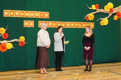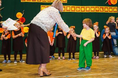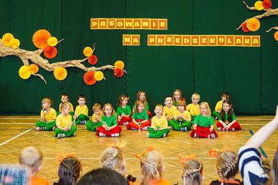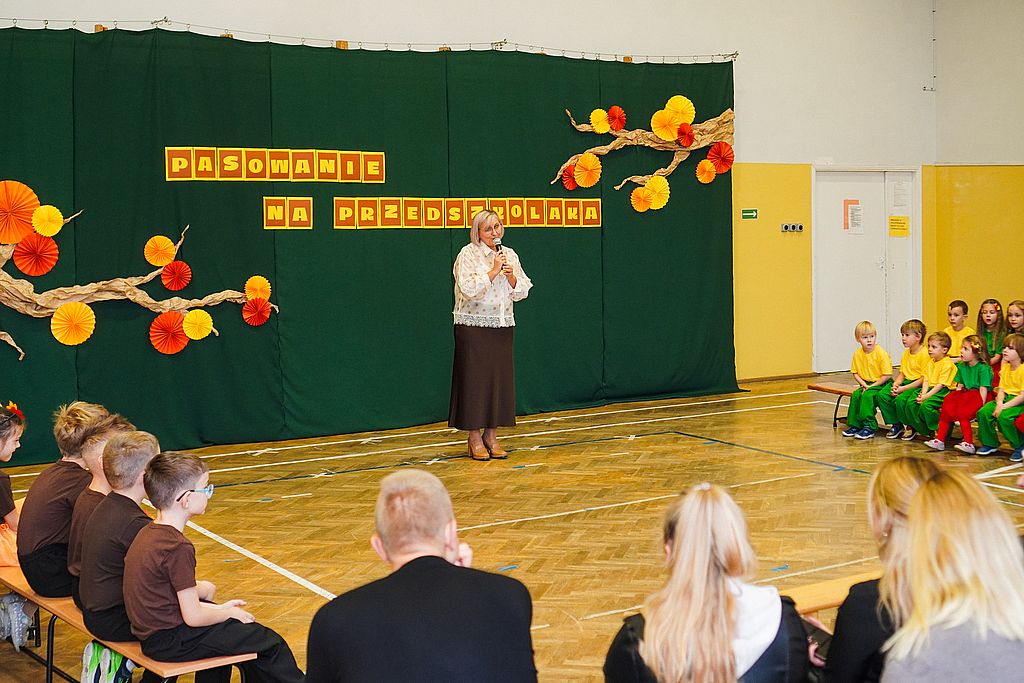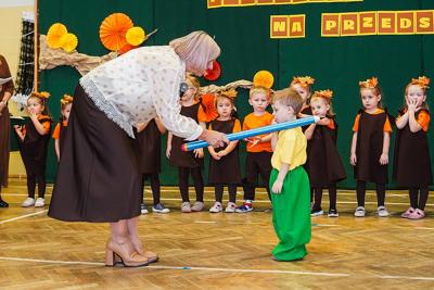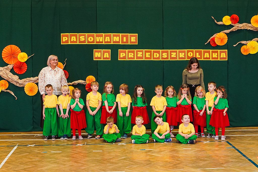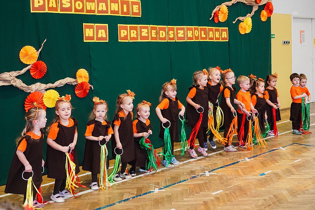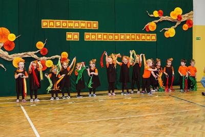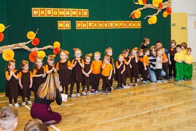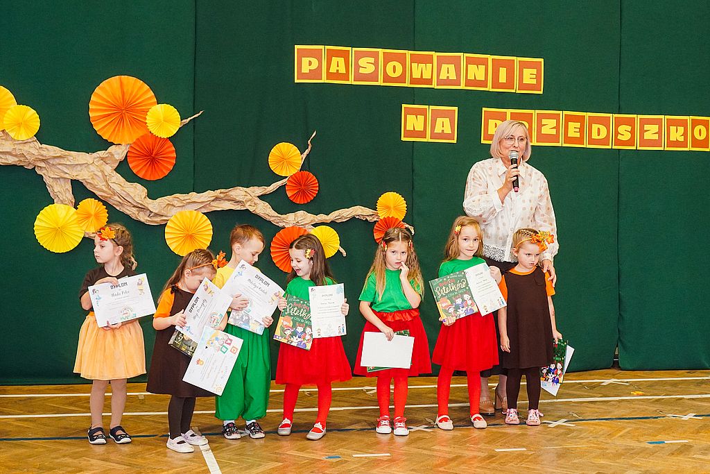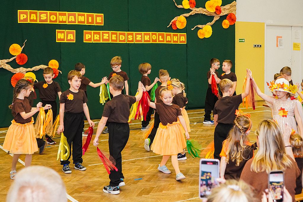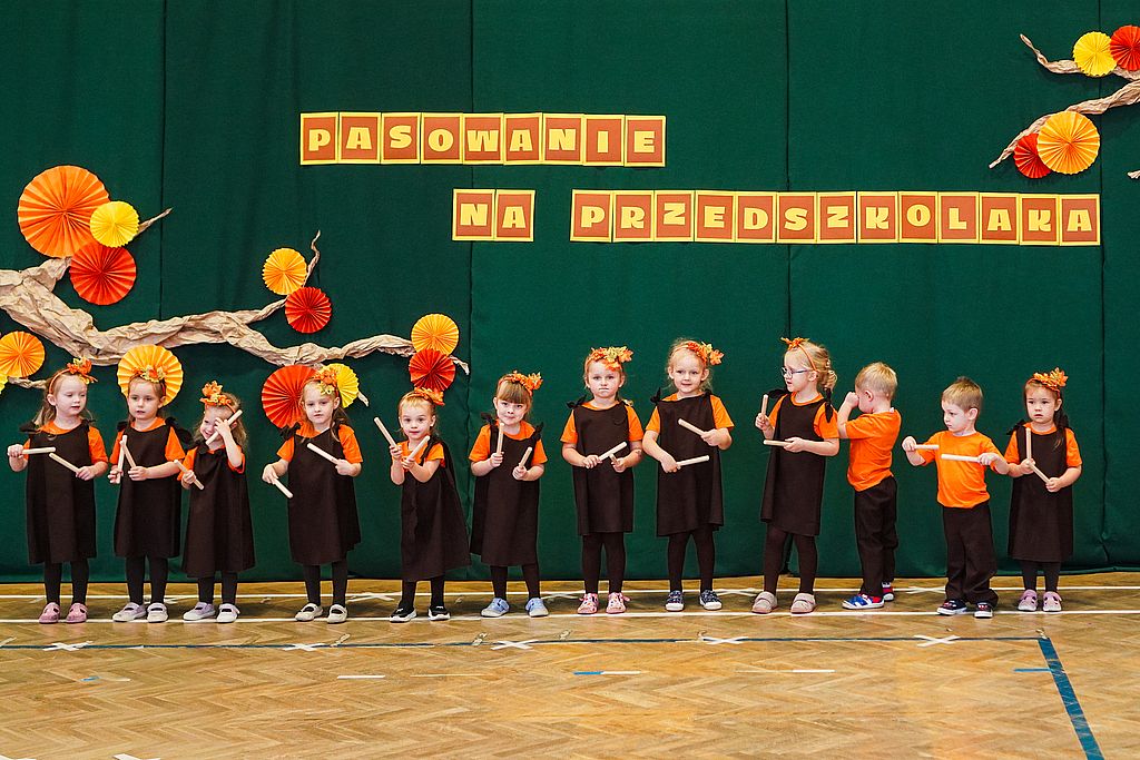 20 listopada w naszym przedszkolu odbyła się uroczystość pasowania. Dzieci zaprezentowały jesienne wierszyki i piosenki, wprowadzając wszystkich w radosny, jesienny klimat. Następnie odbyły się tańce – maluchy z zaangażowaniem wykonały przygotowane układy, pokazując swoje pierwsze sceniczne umiejętności. Nie zabrakło również elementu muzycznego- średniaki z dumą zagrały na instrumentach, tworząc rytmiczną oprawę muzyczną. Kolejną atrakcją był występ starszaków, którzy przygotowali taniec z kolorowymi chustami. Barwne rekwizyty, płynne ruchy oraz wesoła muzyka sprawiły, że pokaz zdobył ogromne brawa. Najważniejszym punktem wydarzenia był jednak sam akt pasowania. Każde dziecko zostało oficjalnie przyjęte do grona przedszkolaków. Pani Dyrektor Jolanta Lipiarz dokonywała symbolicznego pasowania magiczną kredką, a dzieci otrzymały pamiątkowe dyplomy oraz upominek od Rady Rodziców. Pasowanie stało się pięknym początkiem przedszkolnej przygody pełnej radości, nauki i nowych doświadczeń. Po uroczystości Pani Dyrektor wręczyła pamiątkowe dyplomy i nagrody dzieciom biorącym udział w rodzinnym konkursie plastyczno-technicznym pt. "Moja ulubiona postać bajkowa". Uczestnikom serdecznie gratulujemy wyjątkowych prac i życzymy dalszych sukcesów.