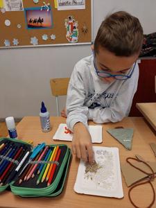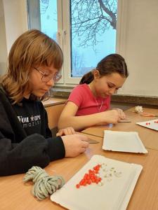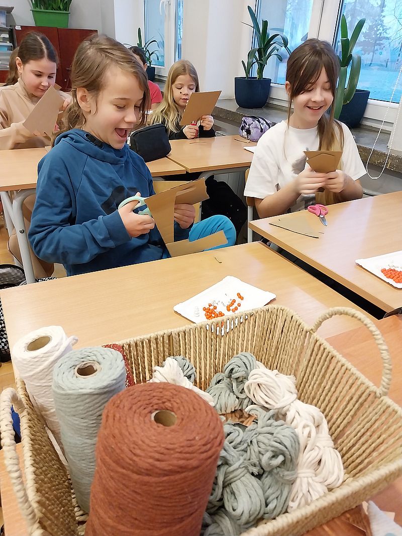 Poranek 16.12.2025 roku był dla klasy IV bardzo tajemniczy. Po wejściu do sali uczniowie zobaczyli wiklinowe kosze, a w nich kolorowe cekiny, guziki, koraliki oraz białe, zielone i brązowe włóczki.