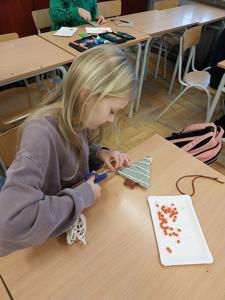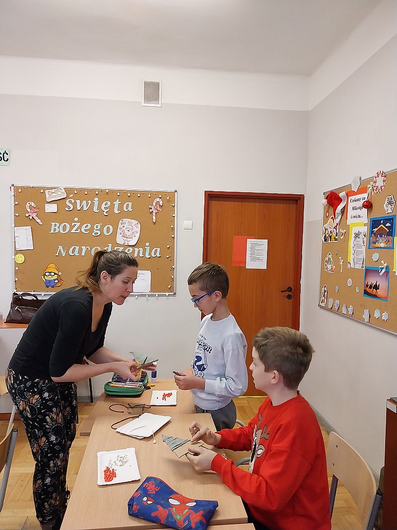 Mama naszej koleżanki Hani, pani Anna Brzeska, poprowadziła świąteczne warsztaty. Zadaniem uczniów było wykonanie tekturowych choinek owiniętych włóczką i ozdobionych przygotowanymi dekoracjami.