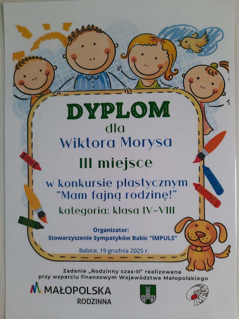 Serdecznie gratulujemy Wiktorowi Morysowi III miejsca w konkursie plastycznym "Mam fajną rodzinę".